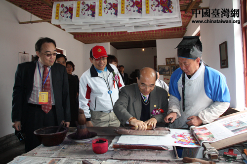 臺灣海峽兩岸教育促進協(xié)會理事長李超群感受版畫藝術。(中國臺灣網(wǎng) 楊永青 攝)