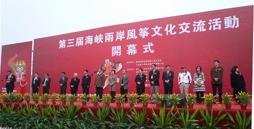 國臺辦《兩岸關(guān)系雜志社》編輯部主任李啟龍,臺北風(fēng)箏推廣協(xié)會、新竹特技運動風(fēng)箏放飛隊、高雄市云霄風(fēng)箏協(xié)會、臺北SKY風(fēng)箏隊、明道大學(xué)代表隊、新竹磐石中學(xué)風(fēng)箏社和臺灣新生代陽光藝術(shù)工作坊七支來自臺灣的風(fēng)箏代表隊及我市寒亭區(qū)中小學(xué)生代表共300余人參加了開幕儀式。