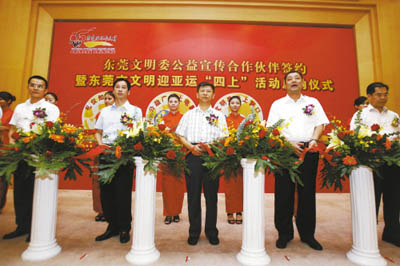 昨日(20日),東莞市正式啟動了包括禮儀知識上電視、公益宣傳上電影、公共禮儀上窗口、文明出行上大巴在內的文明迎亞運“四上”活動,進一步拓展了公益宣傳的新陣地。另外,中國移動東莞分公司、東莞新奧燃氣等25家企業正式簽約,成為東莞文明委公益宣傳合作伙伴單位。這些企業承諾積極投身文明創建,廣泛參與公益宣傳,樹立了良好的企業形象,實現了政企共贏的良性循環。市委常委、宣傳部部長、市文明委副主任王道平出席了啟動儀式。