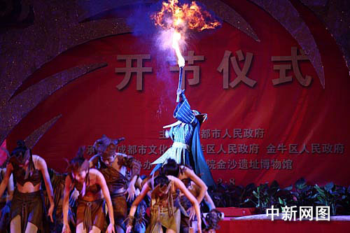 開幕式在一場(chǎng)還原3000年前金沙先民的祭祀盛典舞蹈中拉開序幕。中新網(wǎng)發(fā) 張浪 攝