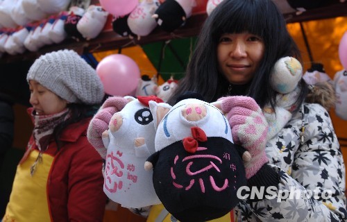 2月13日,中國農歷除夕,第25屆地壇春節廟會開幕。在地壇春節廟會上,豬流感卡通娃娃玩具引人注目。這對豬流感卡通玩具成本極為低廉,售價僅50元人民幣。 中新社發 鄒憲 攝