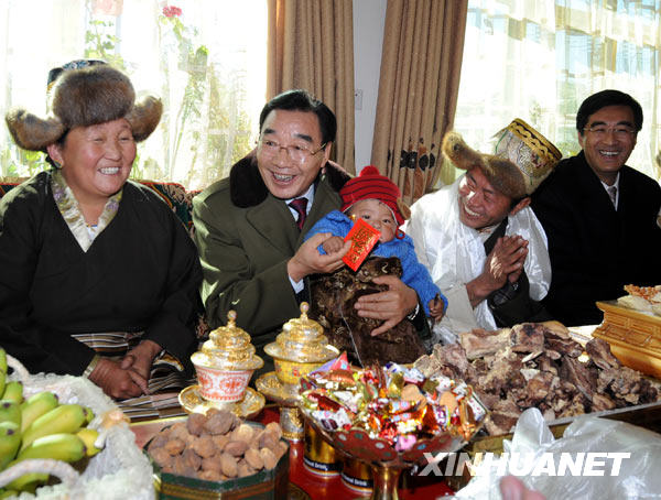 “今年農歷春節和藏歷新年喜相逢,真是雙喜臨門啊!”張慶黎書記為索朗金巴一家帶來了彩電、VCD、餅干等慰問品。