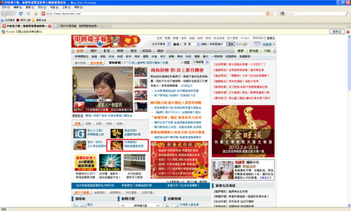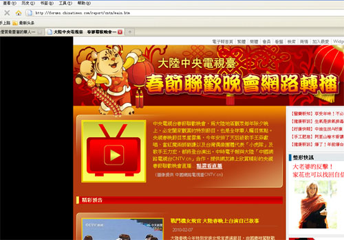 臺灣“中時電子報”網站在數日前就在首頁顯著位置跟蹤報道央視春節聯歡晚會,并設置了直播專區,對央視春晚進行全程直播,供臺灣民眾觀看。 (陳佳慧)