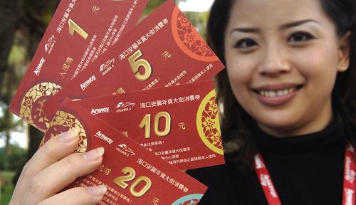 2月8日,臺灣游客在展示年貨購物券。當日,1600多名臺灣游客搭乘排水量7萬噸級的豪華郵輪“海洋神話號”抵達海南省省會海口市參觀游覽。為使臺灣游客直觀地感受海南,海南省旅游部門專門為臺灣游客開設了年貨大街和迎春會,將海南特產、美食和少數民族文化藝術集中一地,供臺灣游客購買、品嘗、觀賞。新華社記者 趙穎全 攝