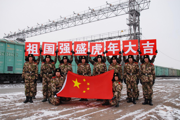 堅守在阿拉山口邊檢站的武警官兵們祝愿祖國強盛,祖國人民虎年大吉(2月13日攝)。