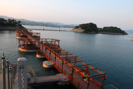 千島湖上的幸運橋是目前中國跨度最大的水上浮橋,總長230米。橋上采用無土栽培技術,偏植瓜果花草和水生植物,橋身兩側噴泉抽取千島湖深層恒溫湖水,在橋身上空交錯排列形成"秀水走廊",也是橋上的天然空調。