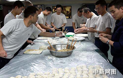 “海口”號導彈驅逐艦官兵包餃子過新年。中新社記者 孫自法 攝