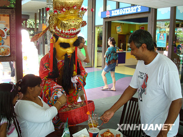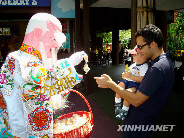 2月13日,新加坡動物園的“財神”給人們分發禮物。隨著虎年春節的臨近,新加坡到處是紅紅的燈籠及威武的老虎裝飾,使獅城到處洋溢著新春佳節的喜慶氣氛。新華社記者張永興攝