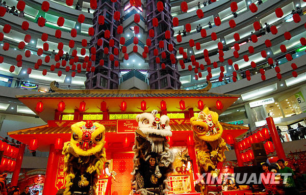 2月13日,一些演員在印度尼西亞首都雅加達的君部達購物商場表演舞獅。新華社記者岳月偉攝