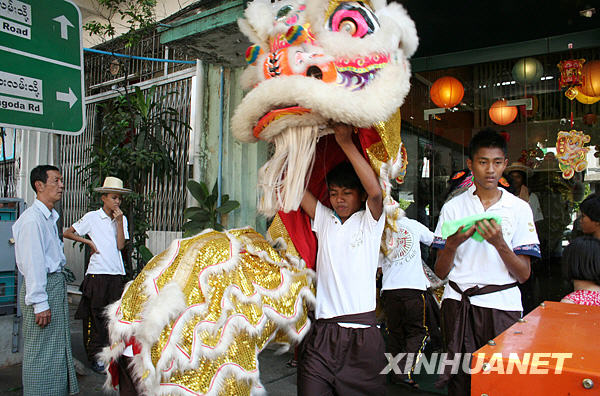 2月13日,演員在緬甸仰光街頭表演舞獅。隨著農歷新年的來臨,仰光街頭充滿了喜慶的氣氛。新華社發(陳美華攝)