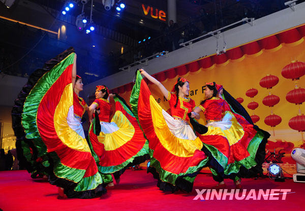 2月19日,在英國倫敦韋斯特菲爾德購物中心,來自中國的演員表演民族舞蹈。