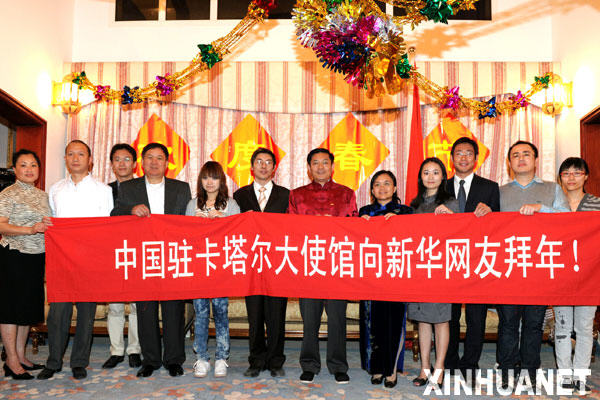 這是中國駐卡塔爾大使館向通過新華網(wǎng)向祖國人民拜年,圖為大使館全體人員照片。多哈分社記者攝影