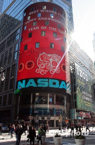 為慶祝中國農歷新年,紐約納斯達克自2月12日下午起,將在中國農歷新年期間于大樓巨幅顯示屏上不定時循環展示慶祝春節的圖片。大紅色屏幕上除有英文“敬祝虎年如意興旺”字樣外,更以中文寫著“恭賀新禧”,氣氛喜慶,吸引了許多路人觀看。納斯達克國際事務負責人麥柯奕說:“中國是納斯達克最重要的全球市場之一,目前已有125家中國公司選擇在納斯達克上市,使納斯達克成為中國以... 中新社發 魏晞 攝