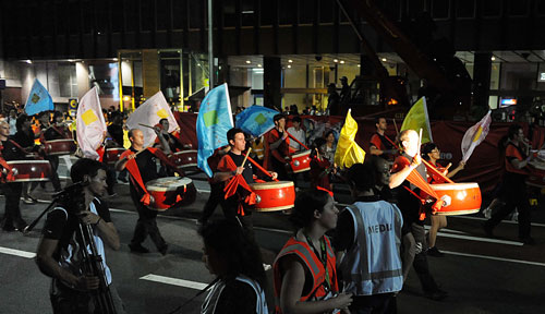 在巡游隊伍中“文化中國·四海同春”的紅鼓彩旗方陣氣勢最雄壯,鼓手有70%是澳洲本地人,炎熱的天氣,沉重的大鼓一點未減他們對中國文化的熱情,鼓手們奮臂擊打,豪情滿懷,其架勢如同猛虎下山,博得在場上萬觀眾的陣陣掌聲,與鼓隊同行的是數十位學生旗手,他們手舉《文化中國·四海同春》的彩旗,隨著鼓隊的節奏揮舞,充分體現了《文化中國·四海同春》促進世界不同文化和諧共生,不同族群和睦相融,讓世界人民共同分享春節的歡樂吉祥的大主題。