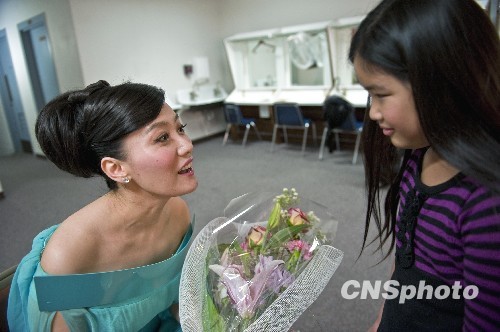當地時間2月21日晚,國僑辦副主任許又聲率領的“文化中國·四海同春”北美藝術團在硅谷佛林特中心上演。2300個座位的劇院座無虛席,解放軍總政歌舞團和軍樂團的藝術家們為觀眾奉獻了精彩紛呈的高水準歌舞節目。圖為一位9歲的華裔女孩李曉娜到后臺向國家一級歌唱演員譚晶獻花。 中新社發 陳鋼 攝
