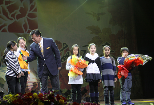 中新網(wǎng)3月3日電 當?shù)貢r間3月1日晚,國務(wù)院僑辦副主任任啟亮率領(lǐng)的“文化中國·四海同春”訪演團在帕多瓦大劇場為意大利威尼托大區(qū)3000多華僑華人及意大利友人送上新春祝福。中國駐米蘭副總領(lǐng)事何鳳云、帕多瓦省省長維多里奧·卡薩林、帕多瓦副市長羅西等與觀眾共享藝術(shù)盛宴。圖為藝術(shù)家劉斌與獻花的孩子們互動。