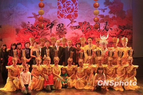 26日晚,中國國務(wù)院僑辦2010年春節(jié)“文化中國·四海同春”藝術(shù)團(tuán)在能容納2500名觀眾的日本愛知縣藝術(shù)劇場(chǎng)舉行盛大演出,為當(dāng)?shù)厝A人華僑和日本觀眾帶來新春的祝福。圖為演出結(jié)束后中國駐名古屋總領(lǐng)事張立國、藝術(shù)團(tuán)團(tuán)長(zhǎng)熊昌良與演職人員、當(dāng)?shù)厝A僑華人代表合影。 中新社發(fā) 關(guān)妍 攝