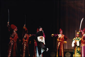 “新在就是主題上有一些變化,第一出戲《一捧雪》,在奴仆忠心的基礎上,我們加上了一個對兒女后代,對兒女親情的力量使他為主人舍掉自己的性命,意思更豐富了,離觀眾更近了;第二出戲《試妻大劈棺》就是在封建的男尊女卑的觀念上有了轉變,并非說莊周試妻就是有理,男女是平等的,我們也增加了一些新的藝術手法和處理;第三出《孫安進京》,我們增加了人性化的內容和大段的藝術手法,包括大段反簧、板式、唱腔等等我們都豐富了,我們保留了傳統的好的東西,豐富了一些新的藝術手法。”