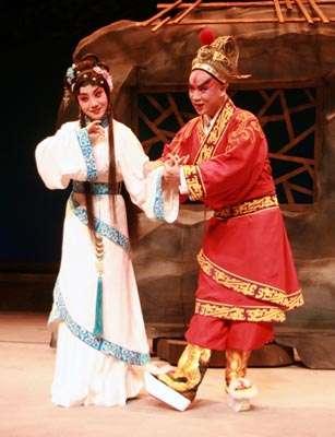 上海京劇院的“金嗓青衣”趙群(左)在劇中飾演弄臣的女兒,臺灣當紅花臉董洪松(右)飾演皇帝。(中新社)