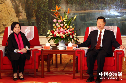 中共中央政治局委員、天津市委書記張高麗在天津迎賓館會見來津出席“海峽兩岸京劇藝術論壇”的臺灣中華婦聯總會主任委員辜嚴倬云女士一行。(中國臺灣網 董潔 攝)