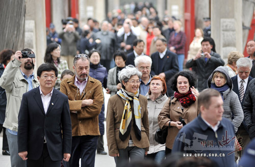 4月10日,歐洲地區駐華大使代表團來曲阜參觀訪問、近距離體驗中國儒家文化。外交部副部長傅瑩,濟寧市委副書記、市長梅永紅,副市長佘春明,曲阜市委副書記、市長劉森,副市長韓冬及濟寧、曲阜有關部門負責同志陪同參觀。