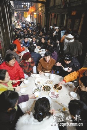 昨天,農(nóng)歷臘月二十八,重慶江津區(qū)中山古鎮(zhèn)擺出千米長(zhǎng)宴,800人同時(shí)下廚,2800余人共進(jìn)午餐慶新春。這是中山鎮(zhèn)第三次在春節(jié)前夕擺下千米長(zhǎng)宴,今年前往吃長(zhǎng)宴年飯的游客人數(shù)是歷屆最多的。