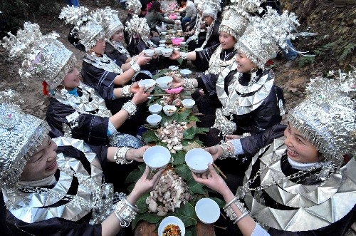 1月31日,劍河縣南寨鄉展留村苗族婦女吃“森林長桌飯”,相互敬酒。 當日是貴州省劍河縣南寨鄉展留村民間傳統的“錫繡苗族姊妹節”的第二天。每年農歷正月初五至初七為展留村舉辦“錫繡苗族姊妹節”的日子。節日期間,村民們舉行祭祖、跳蘆笙舞、吃“森林長桌飯”、馬郎歌會等民俗活動。 新華社發(喬啟明攝)