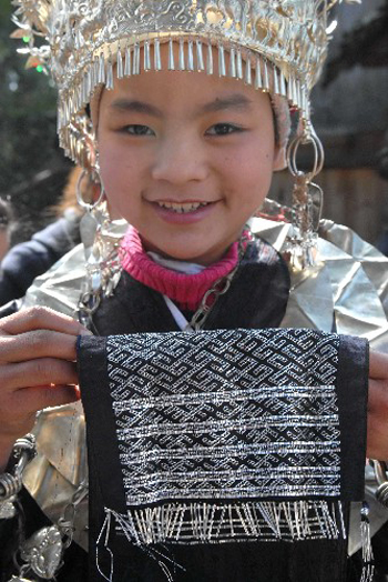 1月31日,劍河縣南寨鄉展留村的苗族兒童展示自己制作的錫繡工藝品。