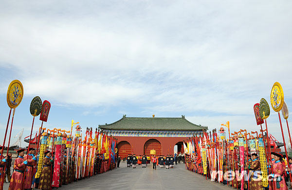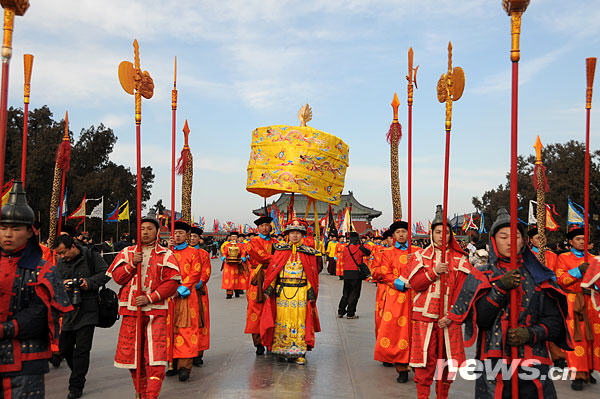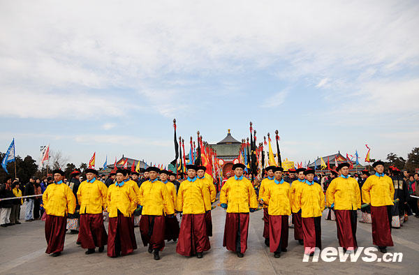 1月20日,在北京天壇祈年殿前進行彩排的祭天儀式現場。新華網 文濤攝 |