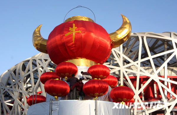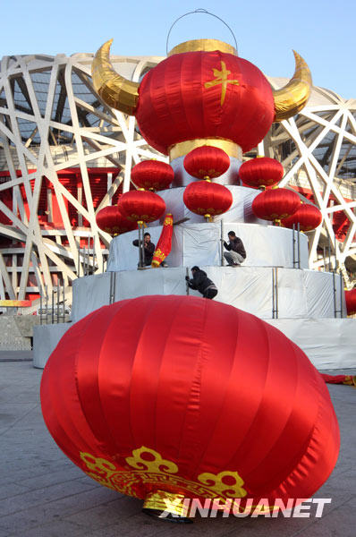 1月24日,工人們在“鳥巢”前安裝牛年主題燈籠。