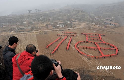 2月4日,太原市攝影家協會的上百名攝影師來到山西陽曲縣安塘村,開展“送福到農家”活動,攝影師和安塘村村民在空地上用紅布展示出一個3600平方米的巨型“福”字,以這種獨特的方式歡慶新春,傳遞祝福,表達對新一年的美好期盼。此外,攝影師還為村民們免費拍攝全家福,并現場洗印出來相贈,受到村民的歡迎。新華社記者 燕雁 攝
