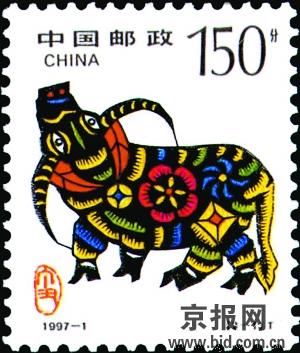 在牛身上,國人一直寓意美好。1985年1月5日發行的第一輪生肖郵票中的T102《乙丑年》,姚鐘華創作的老黃牛圖特種郵票,圖案是昂首站立的一頭牛,剛勁、有力、簡潔,是力與美的象征,表現了牛賦予人的精神力量——吃苦耐勞、踏實溫順、任勞任怨、默默奉獻,用牛的威猛和力量表現一種不斷向上的精神。其后,1997年發行第二輪生肖郵票中的“牛票”,即《丁丑年》特種郵票——“金牛奮蹄”,以民間剪紙為素材,畫面質樸豪放,展現著牛的力量和牛勤勞實干的精神;“牛耕年豐”則古典吉祥、充滿喜氣。整個圖案造型大方穩健,民族風格濃郁,線條粗獷,刀法細膩,色彩斑斕,具有強烈的裝飾韻味和藝術感染力。