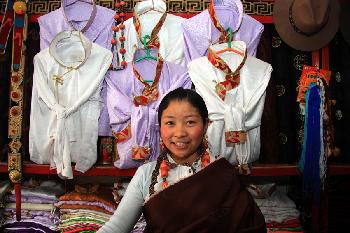 3月14日,藏族姑娘云措在自己家的民族用品商鋪內,她家的店鋪每天都能銷售1000多元的商品。 新華社照片,玉樹(青海)2010年3月14日位于青海南部的玉樹藏族自治州屬于康巴藏區,州府所在地結古鎮自古就是唐蕃古道上的重鎮。隨著青海藏區經濟的不斷發展,玉樹地區各族群眾安居樂業,市場日漸繁榮起來。新華社記者 任曉剛攝