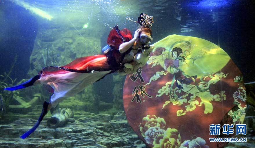 9月22日,扮作“嫦娥”的女潛水員在海底暢游。當日是傳統(tǒng)中秋佳節(jié),武漢東湖海洋世界的女潛水員穿上古裝扮作“嫦娥”,為節(jié)日里前來參觀的游客獻上一幕海底“嫦娥奔月”的演出。新華社發(fā)(王振武攝)