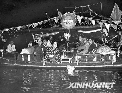 1965年9月10日,來中國參加中日青年友好大聯歡的日本青年朋友,同杭州市青年泛舟西湖,共度中日兩國人民傳統的中秋佳節。章耕辛攝