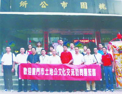 在采訪中,我們發現在仙岳山土地公廟有一面非常精美的旗幟,眉題上寫著“桃園市土地公文化巡禮”,旗幟上的金字則是“廈門仙岳山土地公”。林福壽會長告訴我們,由于兩岸福德文化的淵源關系,仙岳山土地公也多次“跨海”前往臺灣,這面旗幟就是去年參與臺灣桃園市舉辦的福德文化節,桃園市市長代表桃園諸土地公廟贈予的。林會長還說,福德文化對兩岸民俗傳承、兩岸民間交流、兩岸民眾融合發揮了積極的作用。2008年舉辦首屆福德文化節時,臺灣屏東車城福安宮前來參加,他們被熱烈的福德文化節感染,在兩岸宮廟座談會上,主動提出了要主辦第二屆福德文化節。2009年7月第二屆福德文化節在臺灣屏東車城舉行,廈門市閩南文化研究會和湖里區福德文化聯誼會組織幾十位專家、學者、媒體和一百多位信眾前往參加。自從有了福德文化節之后,兩岸的相關交流顯得更加頻繁了。仙岳山的土地公成了臺灣舉辦相關活動時競相邀請的“明星”,湖里區福德文化聯誼會也在臺灣各地的聯誼中增加了親情。在交往中,臺灣許多知名人士,如連戰、宋楚瑜、蕭萬長等還特地會見了廈門的有關代表。到截稿時,即將前來參加第三屆福德文化節的臺灣宮廟已有78家。采訪中我們還得到一條確切的信息:國務院臺辦將第三屆福德文化節列入國務院臺辦2010年重點規劃的交流項目。