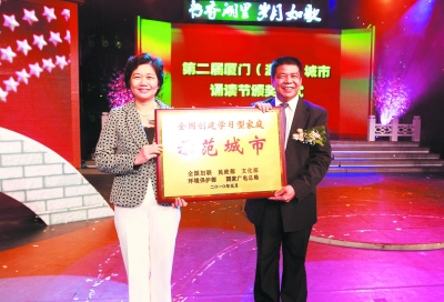 廈門市委常委、宣傳部部長洪碧玲(左)向湖里區委書記李棟梁頒發“全國創建學習型家庭示范城市”獎牌 黃嶸 攝