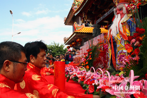 向福德正神敬獻鮮花。(中國臺灣網 董潔 攝)