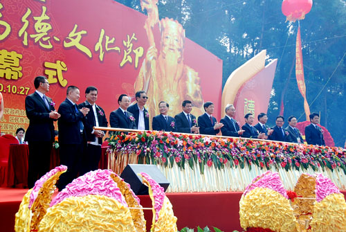 湖里區(qū)委書記李棟梁、福建省海峽文化研究會會長楊華基、臺灣寺廟金蘭會會長王增榮、新加坡道家總會會長陳添來、廈門市政協(xié)副主席陳昌生先后在開幕式上致辭。海峽兩岸關(guān)系協(xié)會副會長張銘清宣布第三屆福德文化節(jié)開幕并邀請在場嘉賓共同推動啟動桿啟動開幕,F(xiàn)場的嘉賓為福德文化墻和海峽兩岸非物質(zhì)文化遺產(chǎn)(仙岳山)展示中心項目奠基儀式培土。