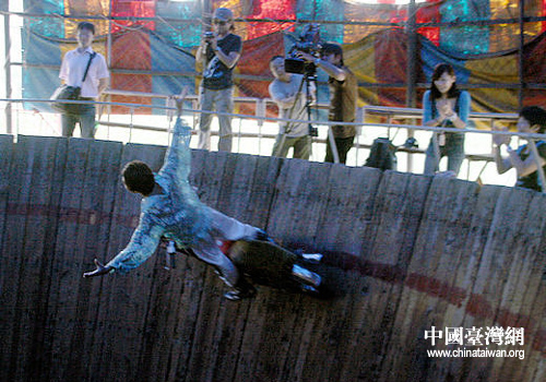 中國臺灣網8月17日沈陽消息 高速飛馳的機車,陡峭如立的絕壁,以及各種高難的特技動作,很難想像這三者竟能完美合一。日前,臺灣中時傳媒采訪團便在沈陽欣賞到了這難以置信的人間絕技——“飛車走壁”。
