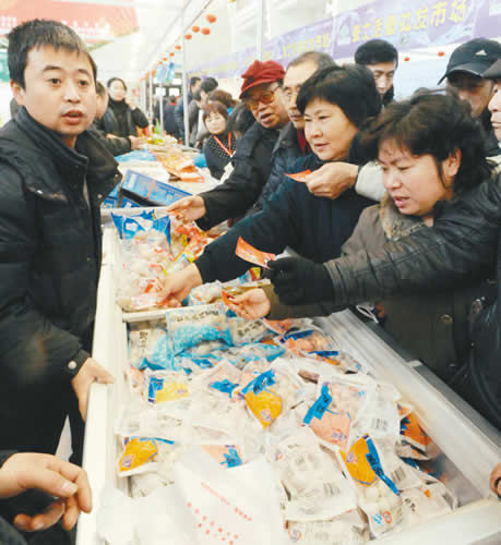 沈陽年貨展銷會于12月9日—13日在遼寧工業展覽館舉行。全市12個農產品批發市場、知名食品品牌、50余家農民經紀合作社及省內外200余家企業聯袂推出果品、蔬菜、糧油、冷凍水產、鮮活水產等參加展銷。(記者 李浩攝)