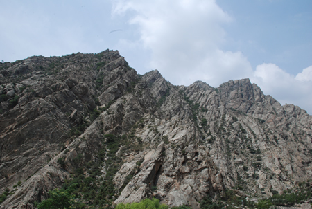 賀蘭山山勢峻峭,景色幽雅,奇峰疊障,潺潺泉水從溝內流出,約有千余幅個體圖形的巖畫分布在溝谷兩側綿延600多米的山巖石壁上。畫面藝術造型粗獷渾厚,構圖樸實,姿態自然,寫實性較強。以人首像為主的占總數的一半以上。其次為牛、馬、驢、鹿、鳥、狼等動物圖形。有部分人的手和太陽的畫面,還有原始宗教活動的場面。