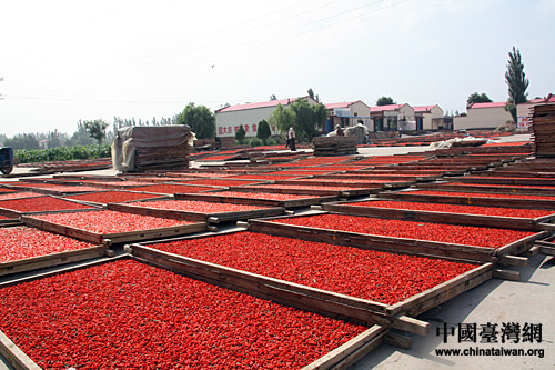 農家的院落中,晾曬的枸杞象紅色的海洋。(中國臺灣網 董潔 攝)