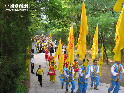 7時45分,海峽兩岸文化界人士在祭祀樂隊的引領下,懷著虔誠之心,莊嚴肅穆地緩緩登上橋山。引領的旗隊中最前面的幡旗上分別寫著:“心香一柱祭軒轅”、“古柏千年迎赤子”。祭陵人員來到黃帝陵前,全體肅立。