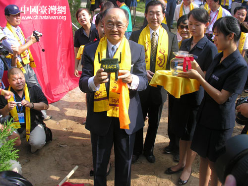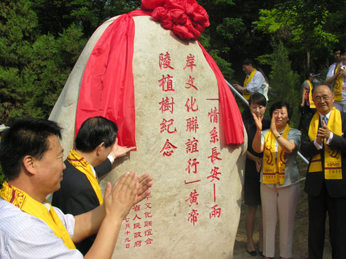 隨后,程建人與焦仁和同延安市、黃陵縣政府領導一起,為植樹紀念碑揭幕。紀念碑上書18個大字:“情系長安——兩岸文化聯誼行”黃帝陵植樹紀念。