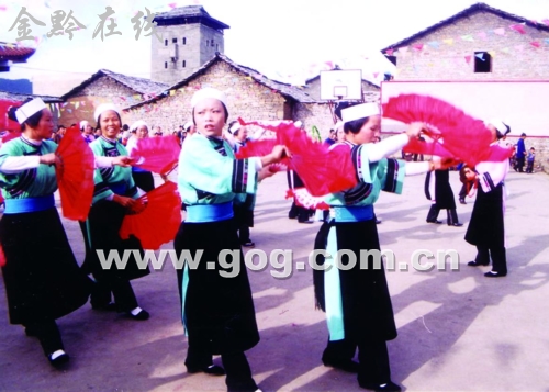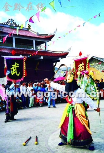 鮑屯有一種古老而神奇的武劇,過去人們叫它“跳神”。其實,這種武戲是一種在我國北方、中原、沿海等地早已失傳的古“軍儺”是鮑屯人的始祖最早把它引進到安順地區并保存至今的軍事戲劇的“活化石”。因為它與戰爭有密切關系,我們又叫它戰爭舞蹈,簡稱“戰舞”。
