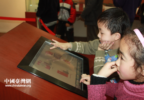 兩個小朋友在博物館展示廳屏幕系統前查找信息(中國臺灣網 李丹 攝)