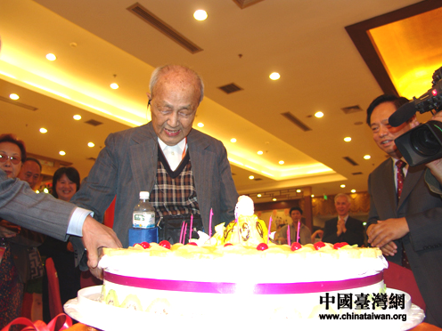 座談會(huì)后的晚宴上出現(xiàn)了令人驚喜的一幕,此行顧問(wèn)林憲老先生是目前“臺(tái)灣光復(fù)致敬團(tuán)”惟一健在者,而11日恰恰是林老的八十八歲壽誕,當(dāng)這一喜訊被公布時(shí),大廳沸騰了。隨著五彩斑斕的蛋糕推至林老面前,兩岸同胞起身同唱生日歌祝福林老,現(xiàn)場(chǎng)氣氛歡快而溫馨。