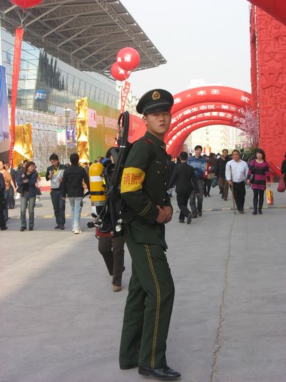 西洽會上的消防巡邏員隨身背著滅火器
