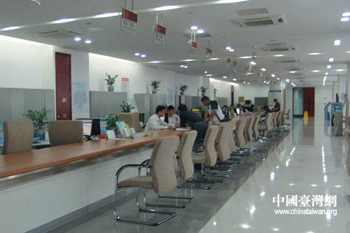 舒適的大廳內(nèi),中心工作人員熱情地為客戶辦理業(yè)務。(中國臺灣網(wǎng) 李典典 攝)